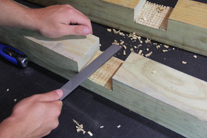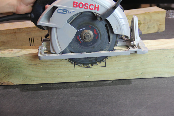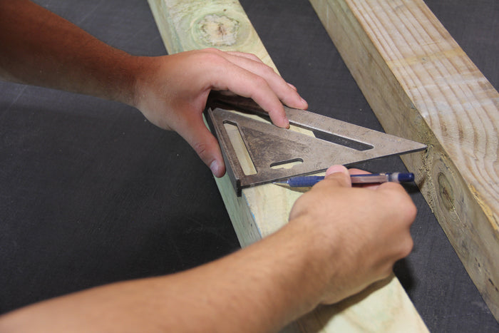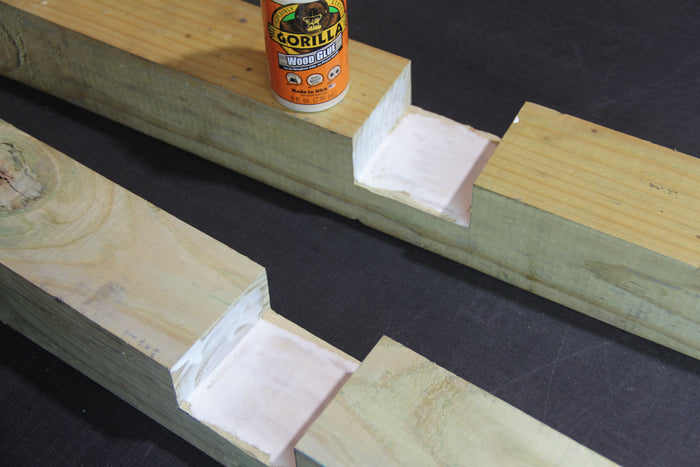 Mark sections for the vertical and horizontal posts to joint together. For the exact measurements, refer to the dimension images. For the veriticle post, start the joint 13" from the top. For the horizontal post, start the joing 9" from one end. Each joint should be 3 1/2" wide and 1 3/4" into the post (this is for the width of a nominal 4x4 post, this measurement should be the width of the post you are using).