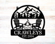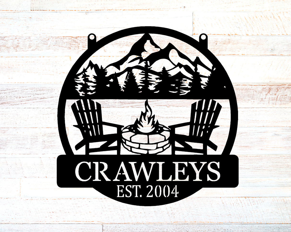 Chairs-Firepit-Mountains Personalized Round Metal Sign - Two Lines