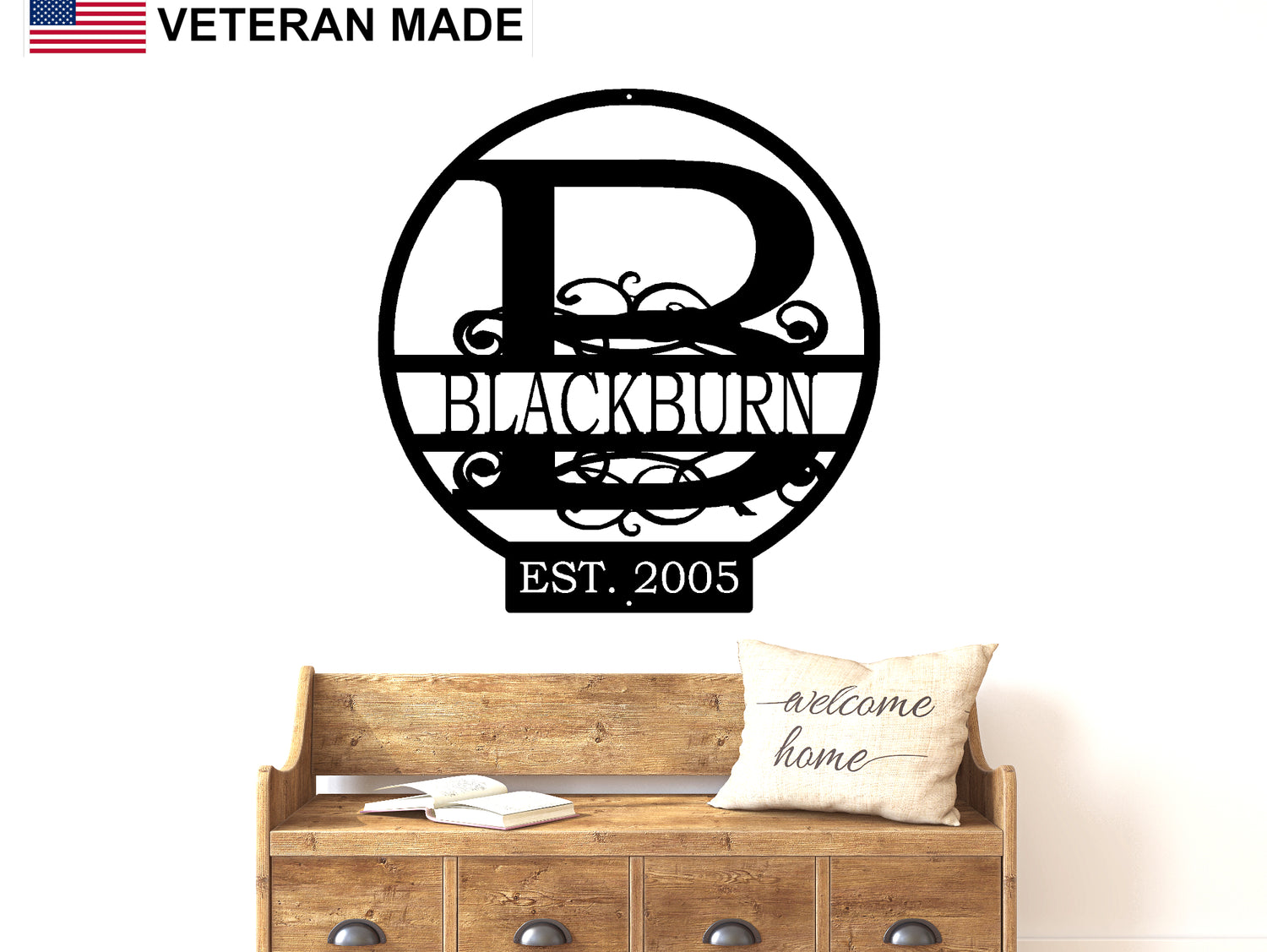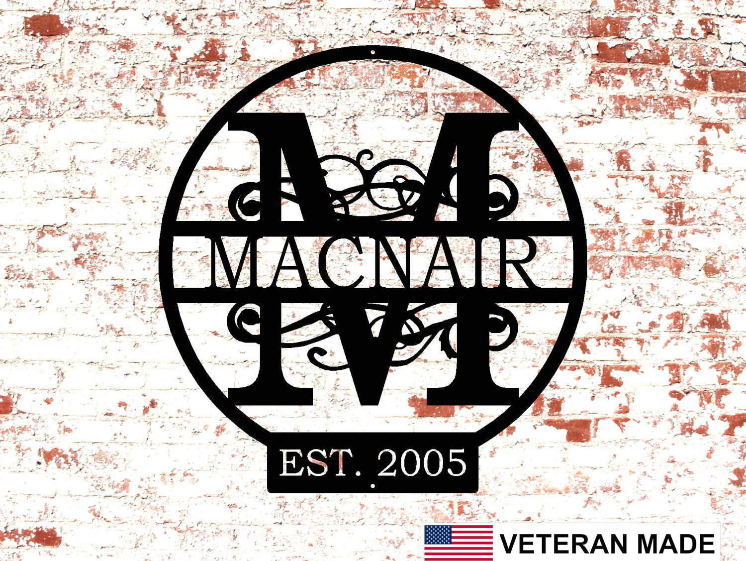 Monogram Bushy Scroll Personalized Round Metal Sign - Name, Initial and EST. Date