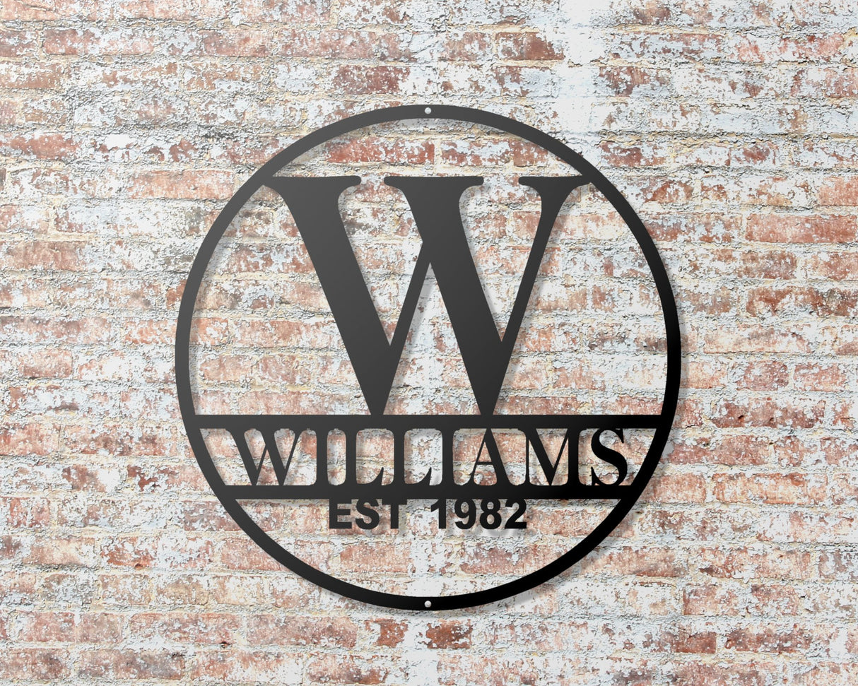 Letrero de metal personalizado con círculo de monograma con nombre y EST. Fecha