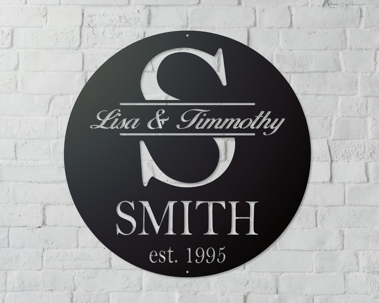 Letrero de metal personalizado con monograma y círculo sólido con nombres y EST. Fecha