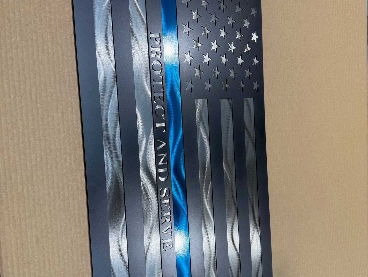 Hand crafted and meticulously made. This piece is made of two pieces of steel stacked on one another. The bottom layer of steel is bare shiny steel with fancy grinding done to simulate a waving flag, which has a really cool affect as it changes as you walk by it as the light reflects off the grinding marks. Most It's hard to capture in pictures but it looks magnificent and truly stands out. We then put a transparent blue striping on it for the blue line. Then we powder coat the bottom layer in a clearcoat powder coat for protection and shine that really brings the grinding out!