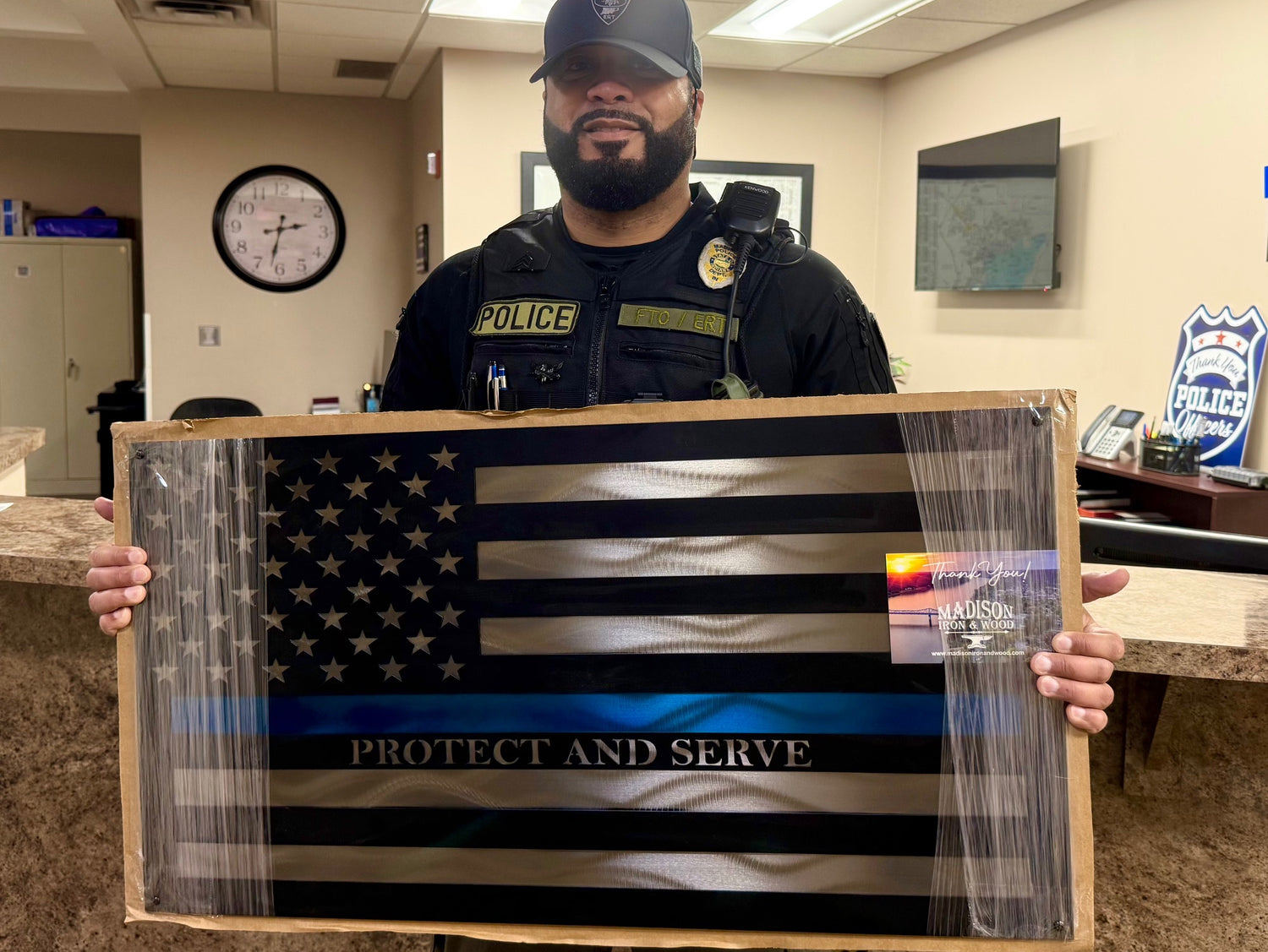 The top layer is a powder coated blacked out American Flag with "PROTECT AND SERVE" on one of the stripes. This can be changed if desired and we can add different things to another stripe if desired like "SGT THOMPSON" or whatever you would like to make it special. These are made to order so we have a lot of flexibility in this.